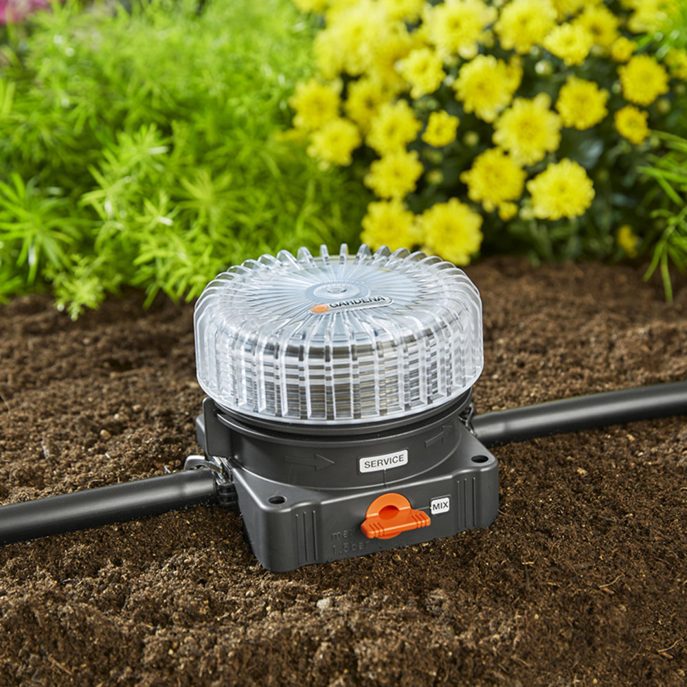 The Gardena 8313 Fertiliser Dispenser is ideally suited for adding a Liquid Fertiliser to the Gardena Micro-Drip-System. The large filling opening and the valve for emptying before frost or before filling with liquid fertiliser render handling of the dispenser especially easy. The filled quantity of fertiliser can be controlled with the level indicator. The Fertiliser Dispenser is supplied with connections for the Connecting and Supply Pipe. The patented "Quick & Easy" connection technology allows a particularly easy mounting of the Fertiliser Dispenser.