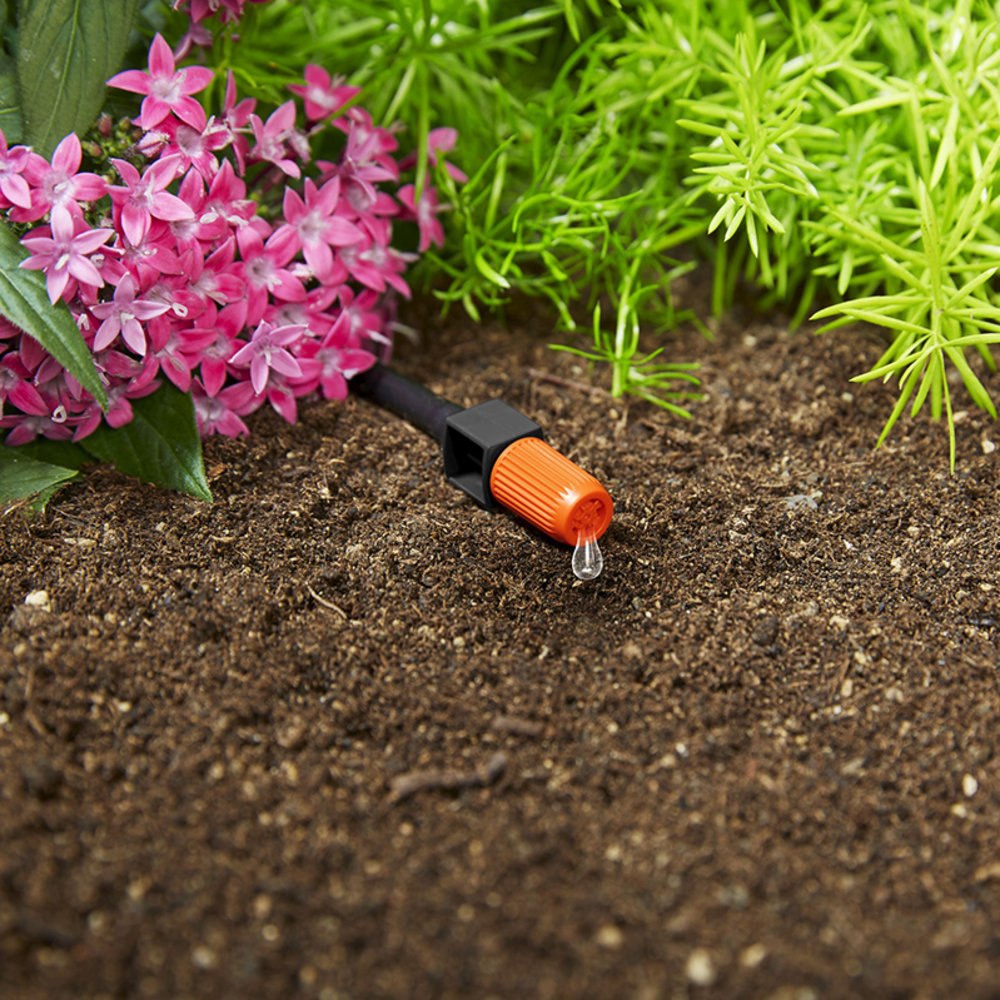 Le goutteur de fin de ligne réglable Gardena 1391 convient particulièrement à l'arrosage ponctuel de plantes isolées ou de rangées de plantes plus longues aux besoins en eau similaires.